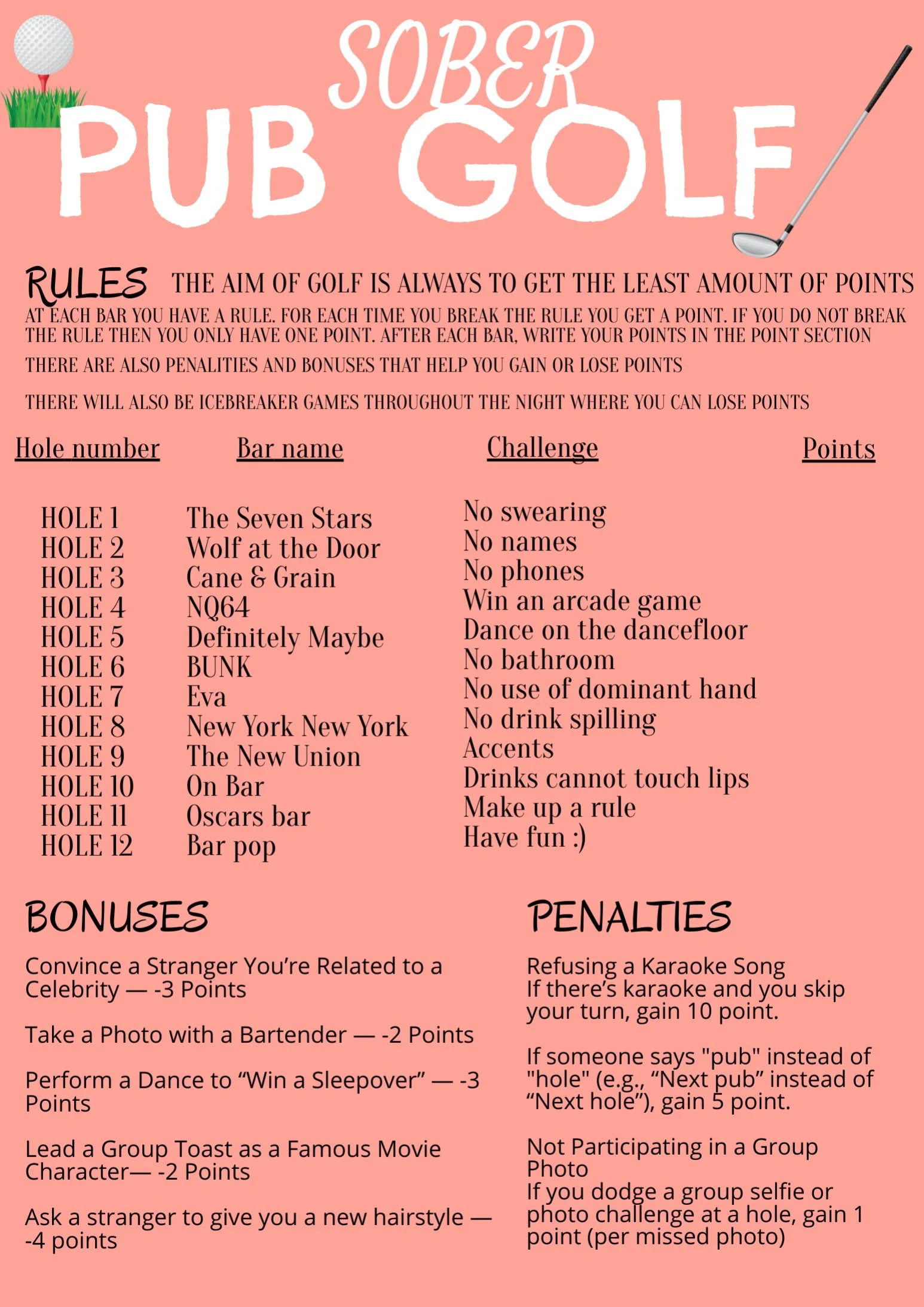 Don’t ever say I don’t love to host. I arranged a night out with some of the girls from the Sowerby bridge walk at the gay village. When 2 of the girls said they didn’t like to drink I said “FEAR NOT. FOR I AM THE MAKER OF FUN.” And thus, sober pub golf was created.