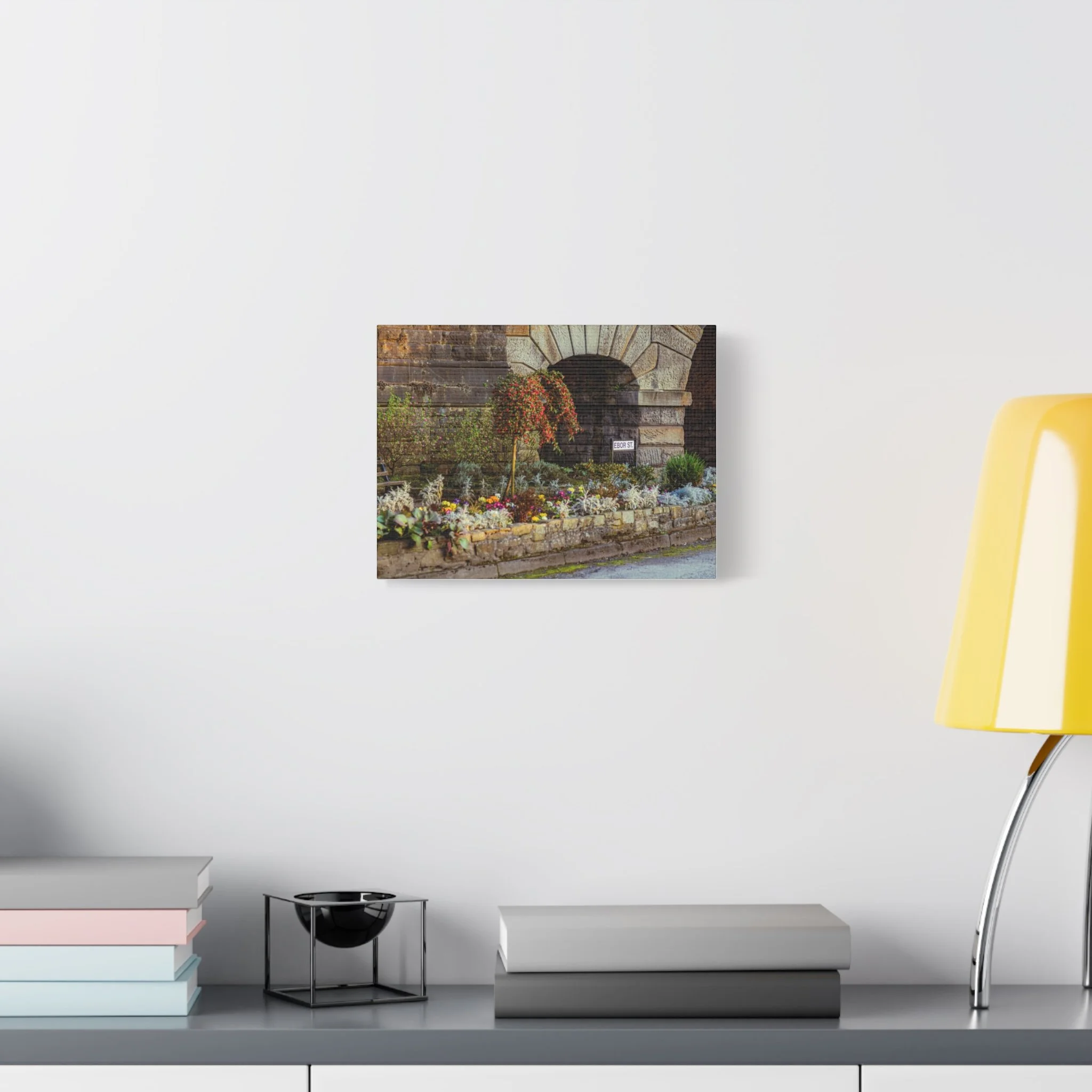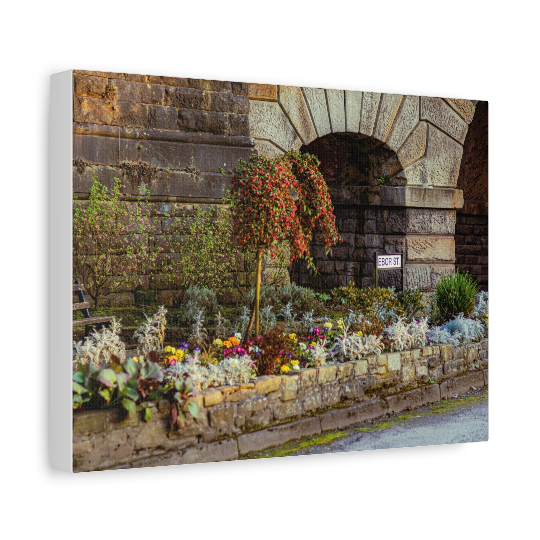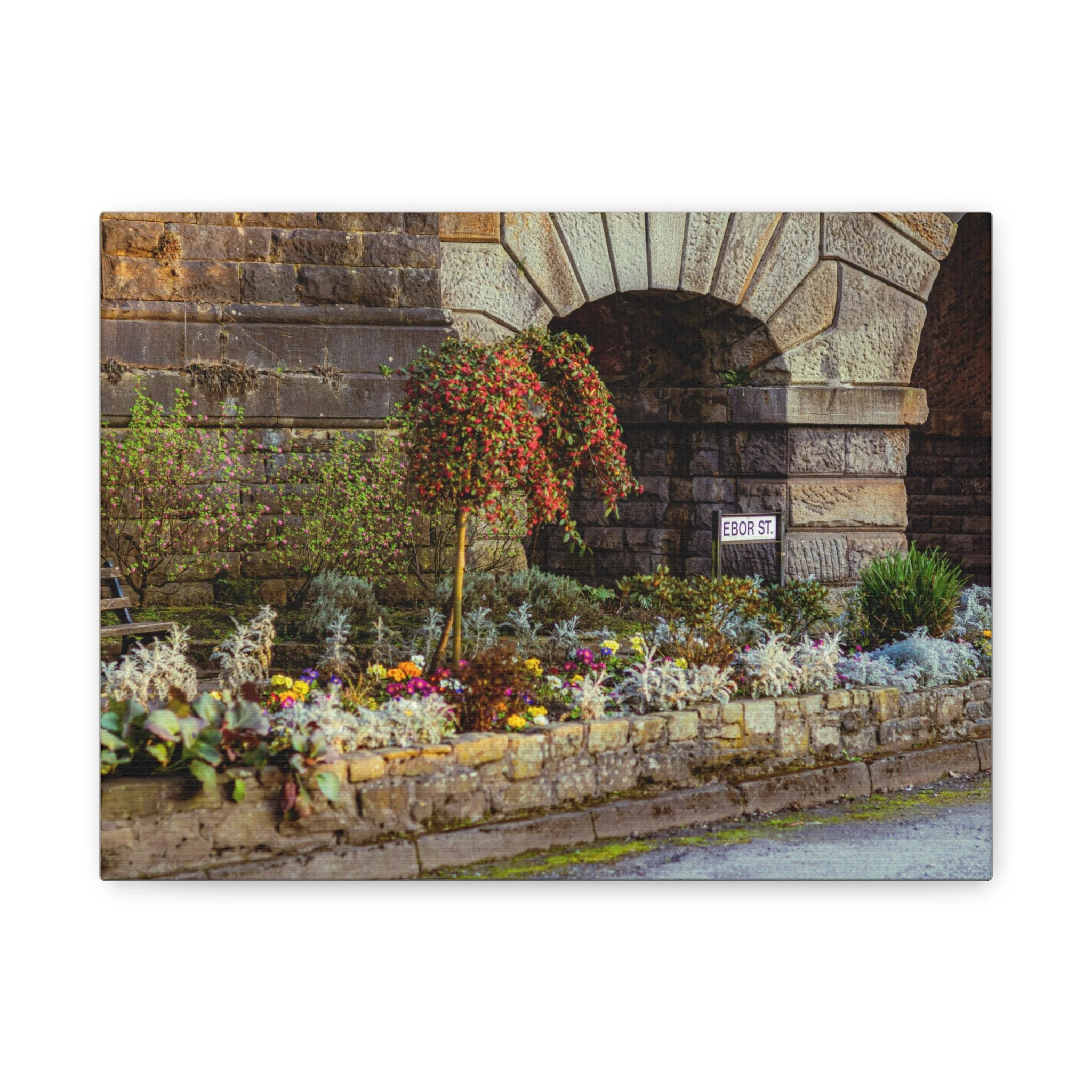 A warm, lived-in canvas print that brings a quiet corner of the garden indoors. Textured matte surface softens highlights and deepens the stonework’s character while preserving the delicate colors of the flowers. Hang it over a mantel, lean it on a bookshelf, or place it in a cozy hallway to introduce a moment of calm — the hush of leaves, the weight of old stone, and the small riot of seasonal blooms. The stretched 1.25" pine frame sits close to the wall for an understated gallery look. Each print is produced with low-VOC, UL-certified Greenguard Gold inks on a durable cotton-poly canvas, and arrives ready to hang with soft rubber support dots to keep it steady.