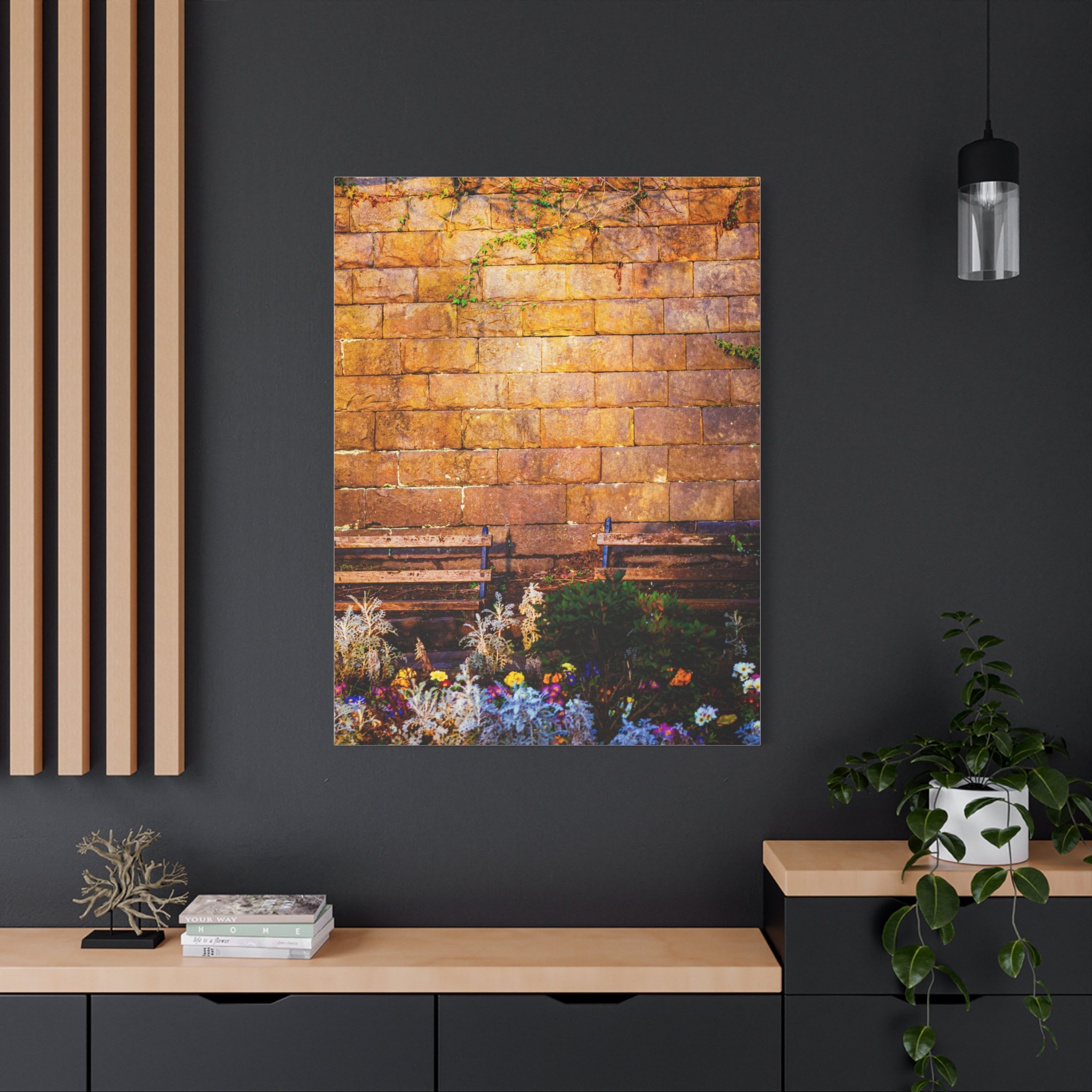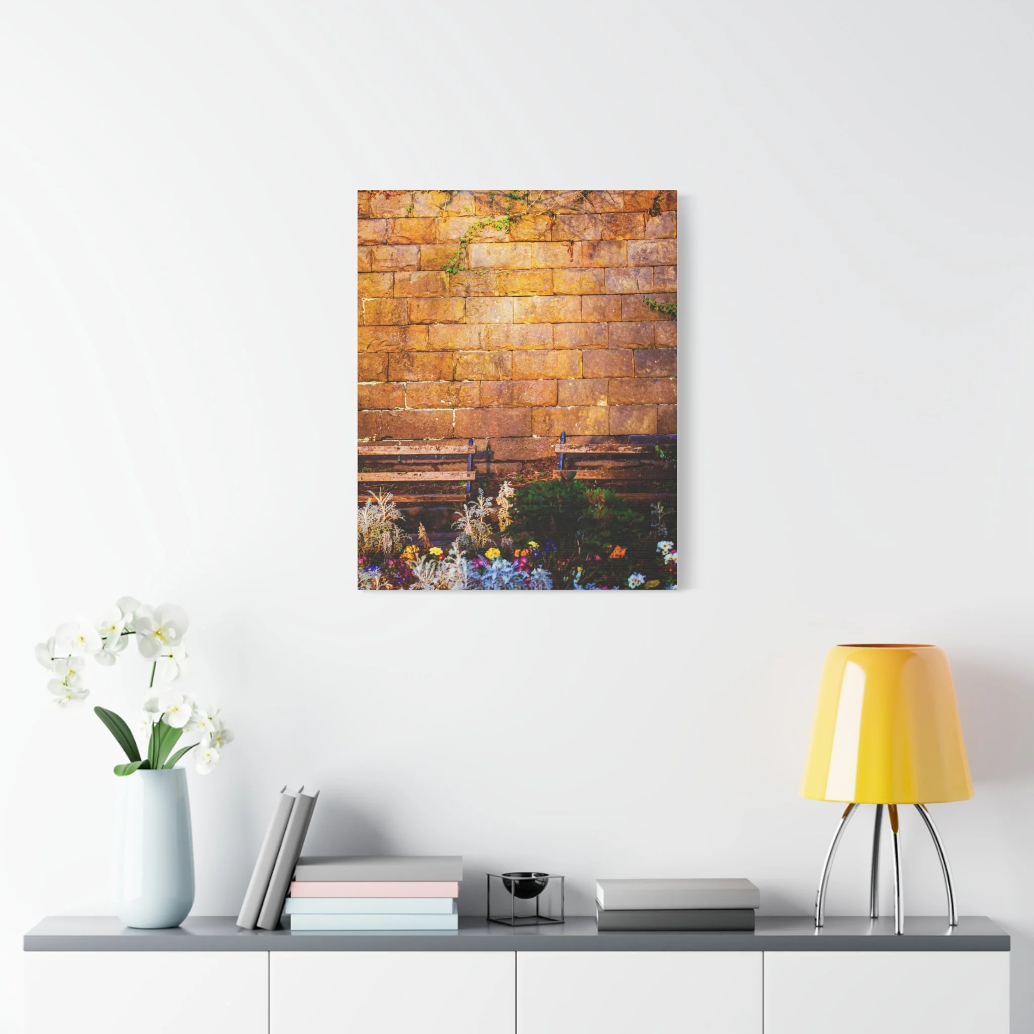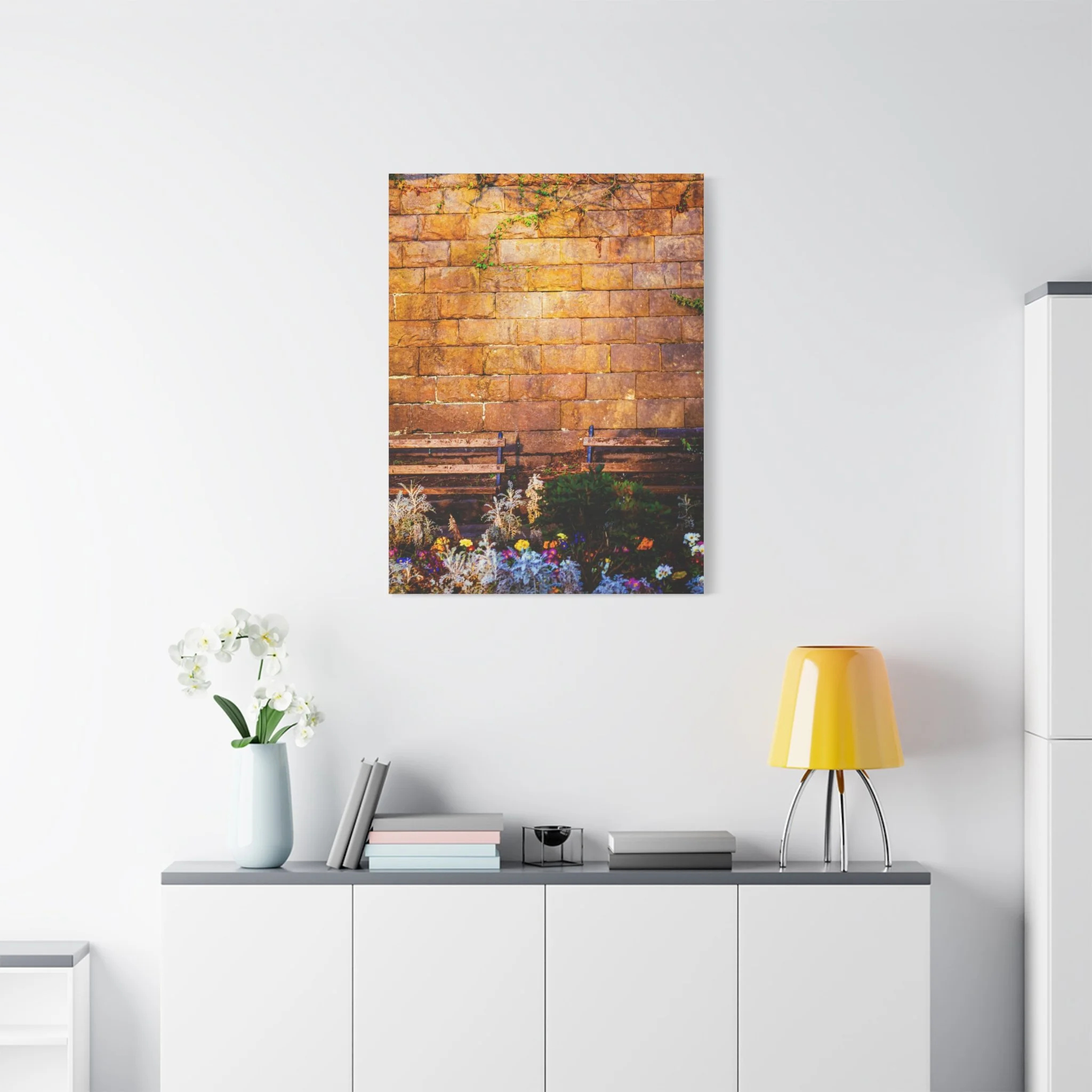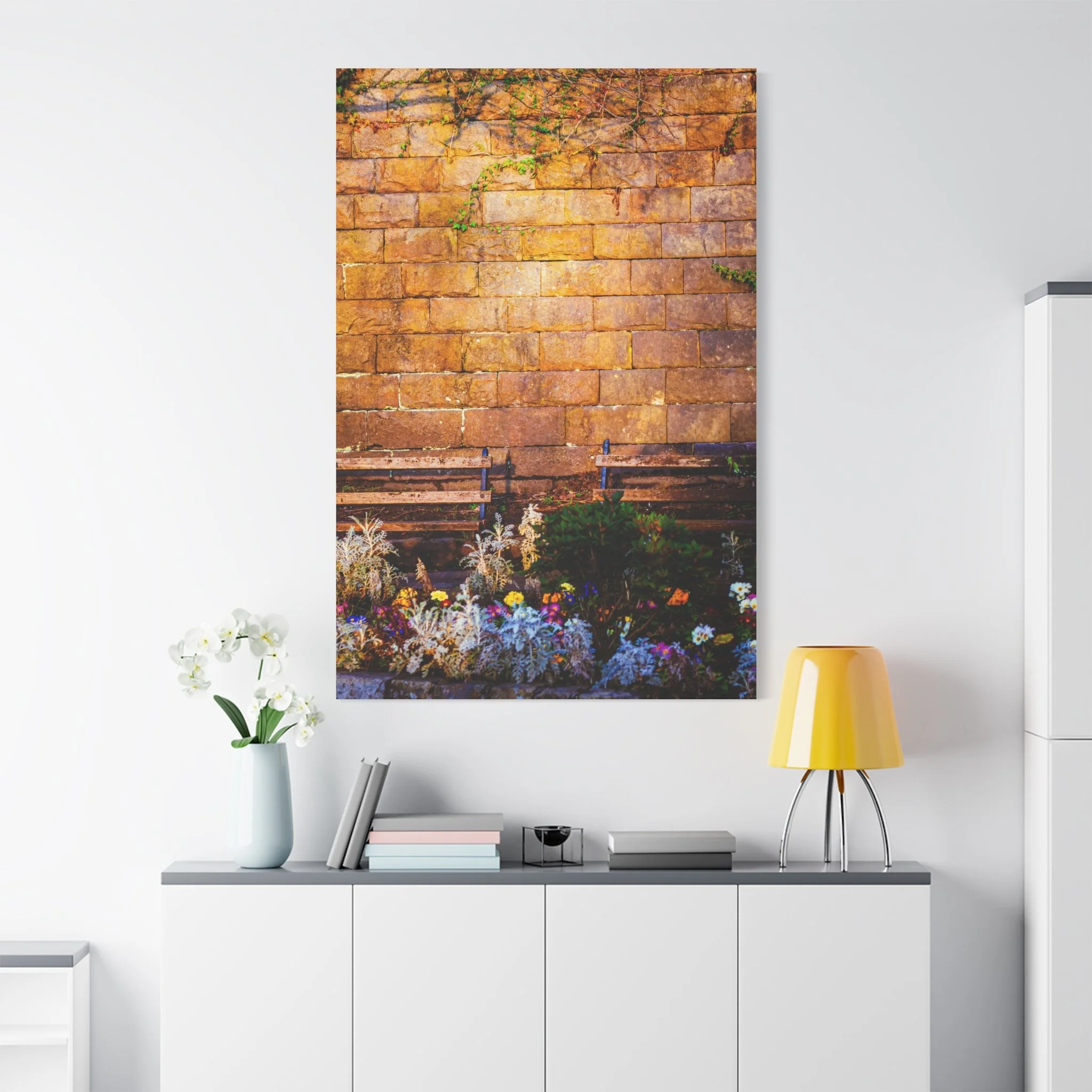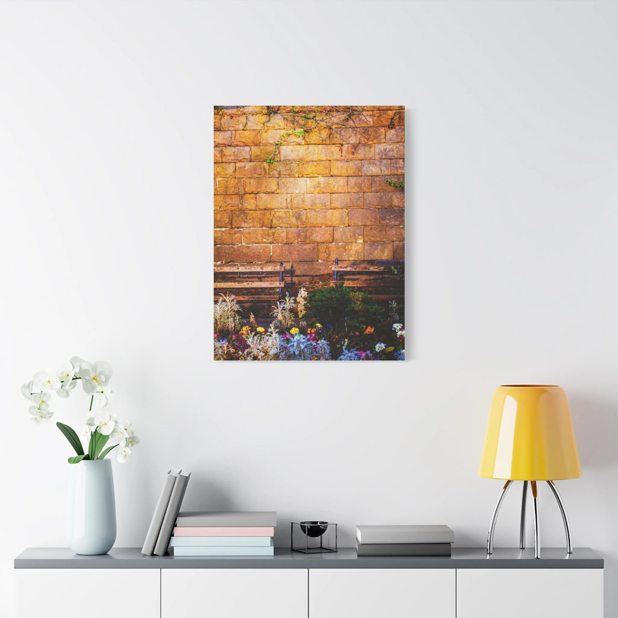 Garden Bench Against Rustic Brick Wall — Matte Stretched Canvas