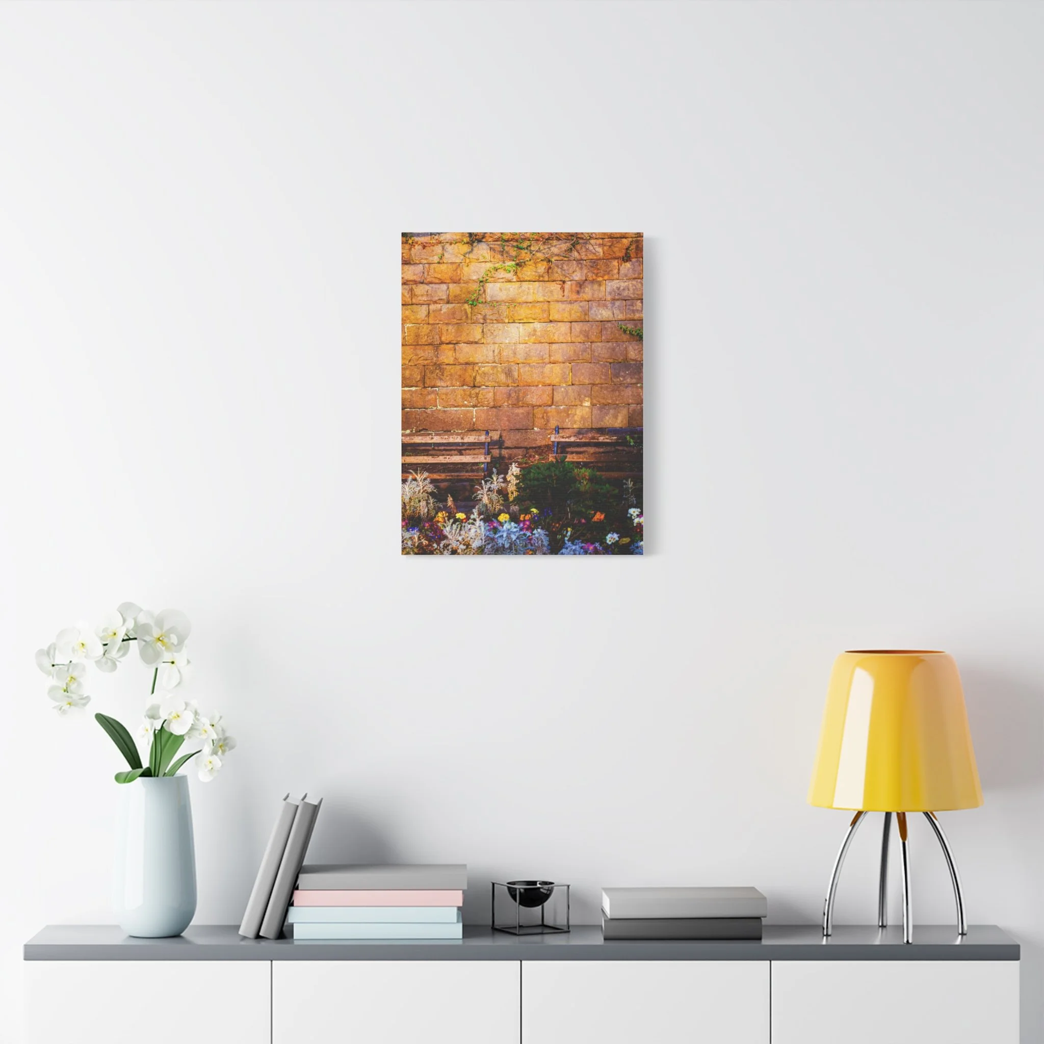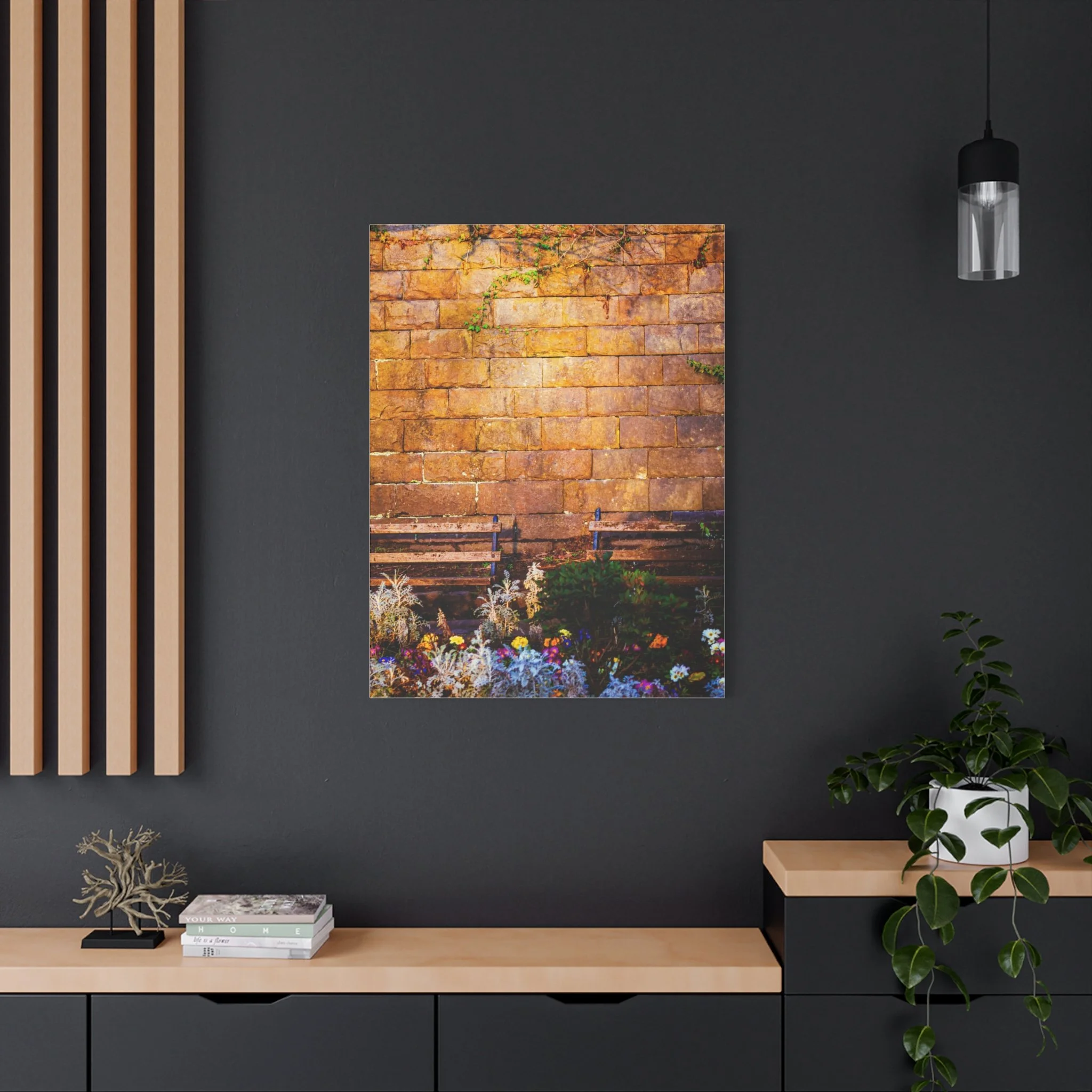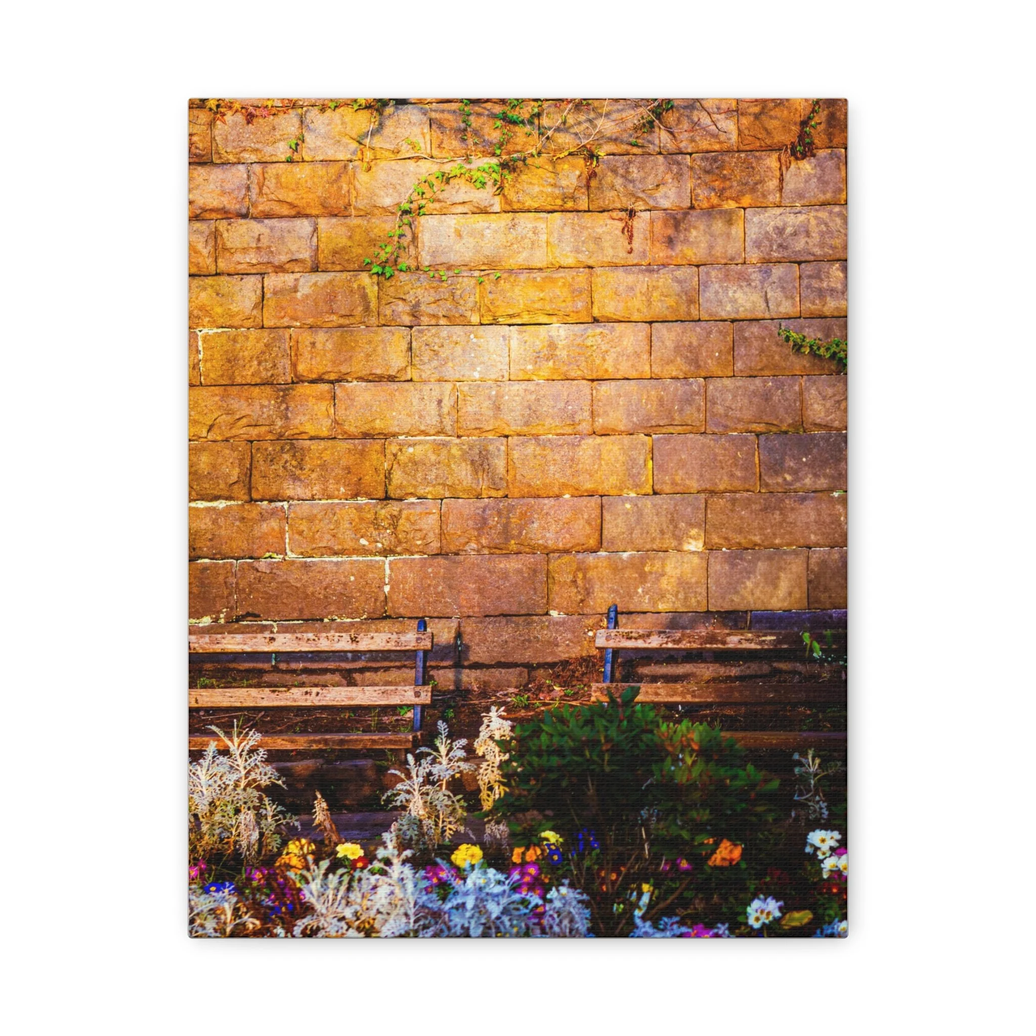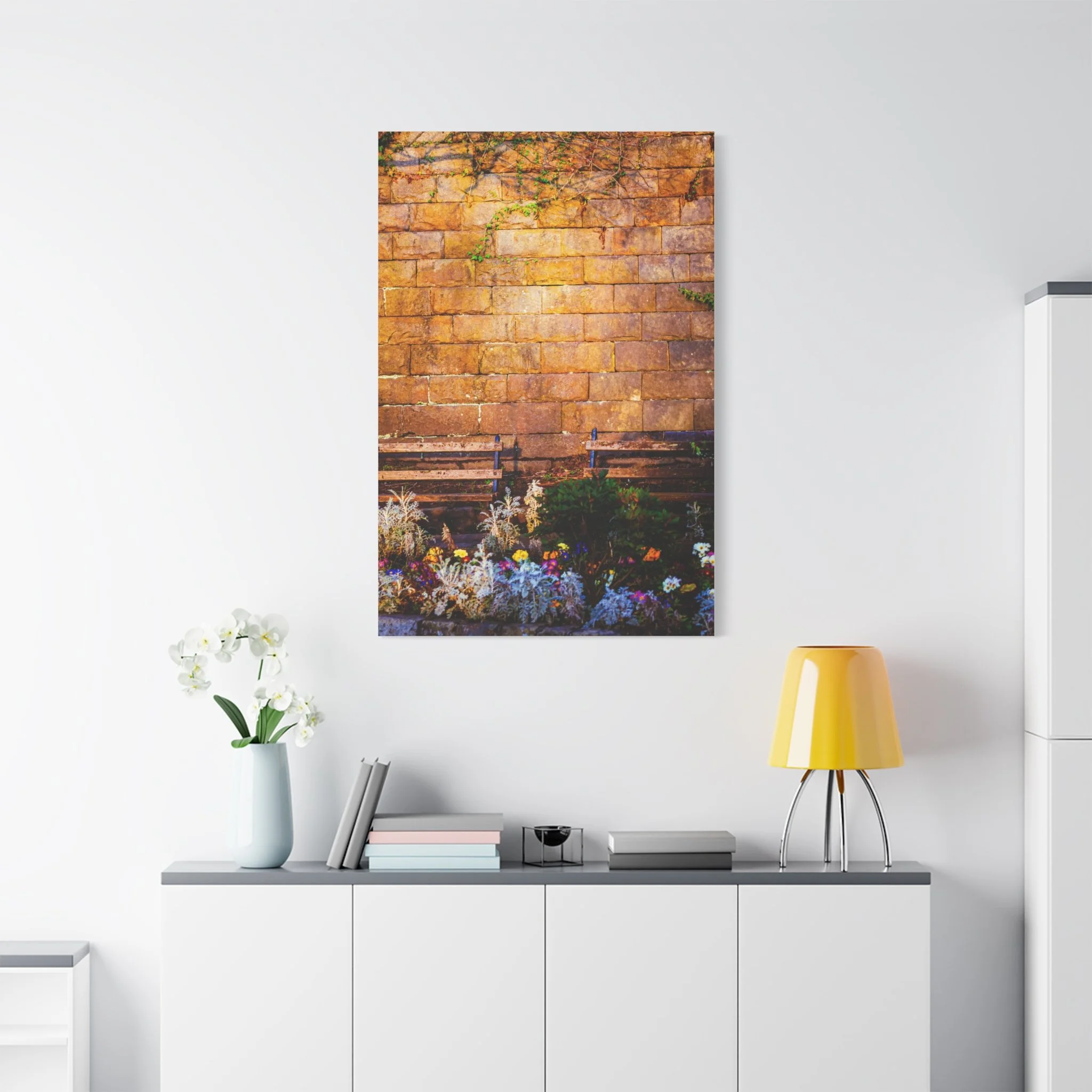 Garden Bench Against Rustic Brick Wall — Matte Stretched Canvas