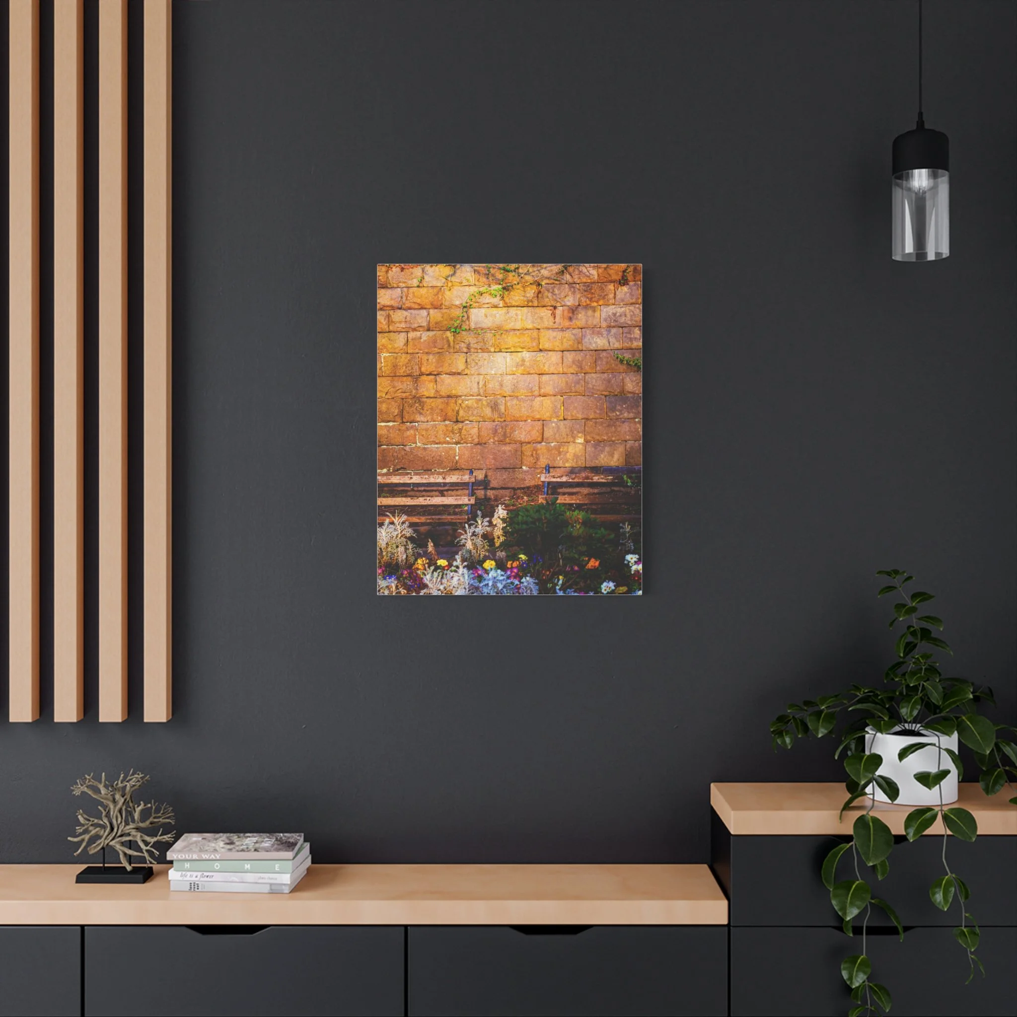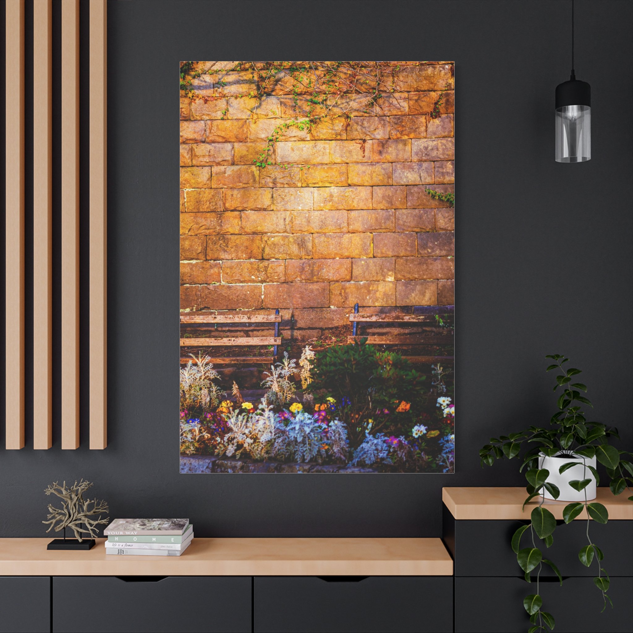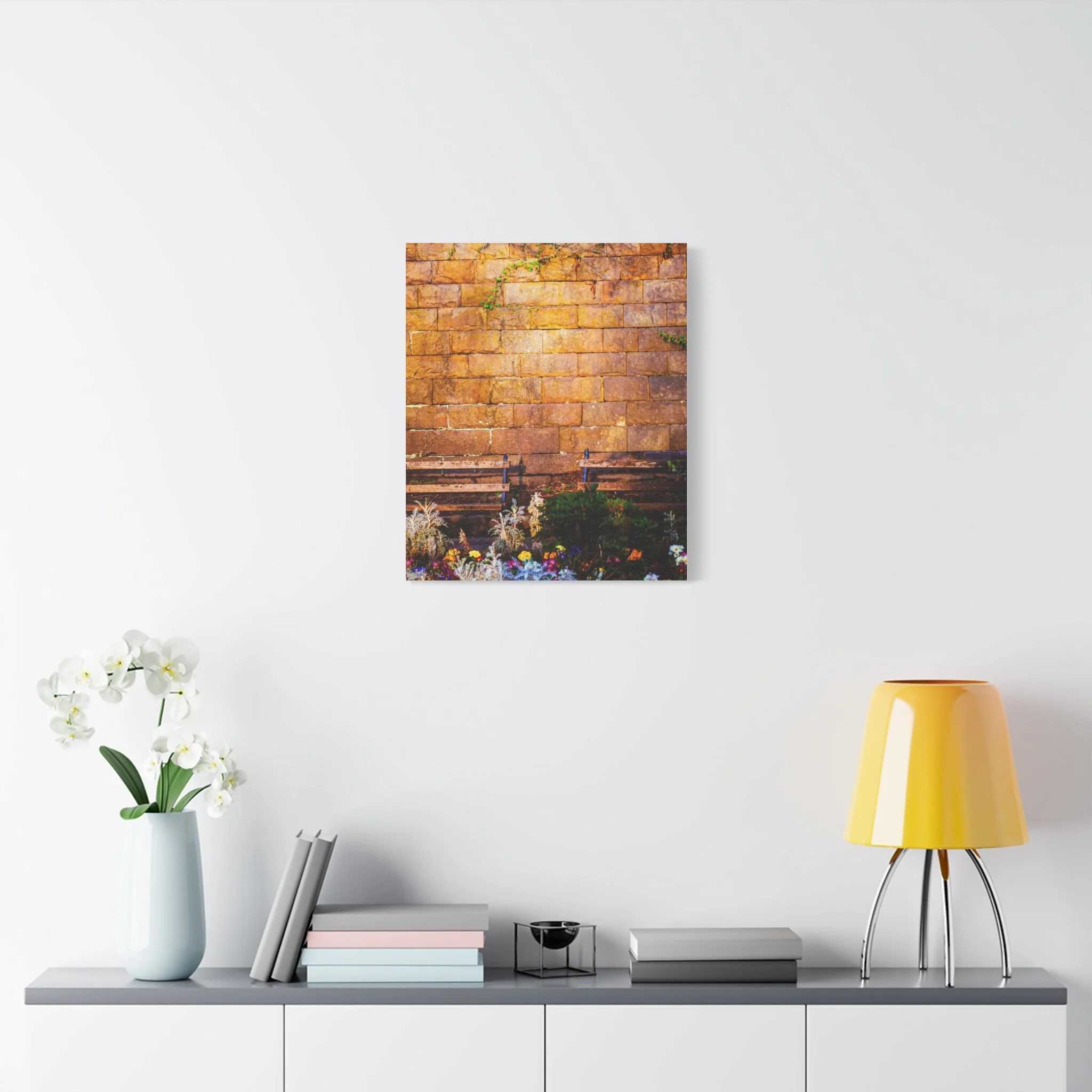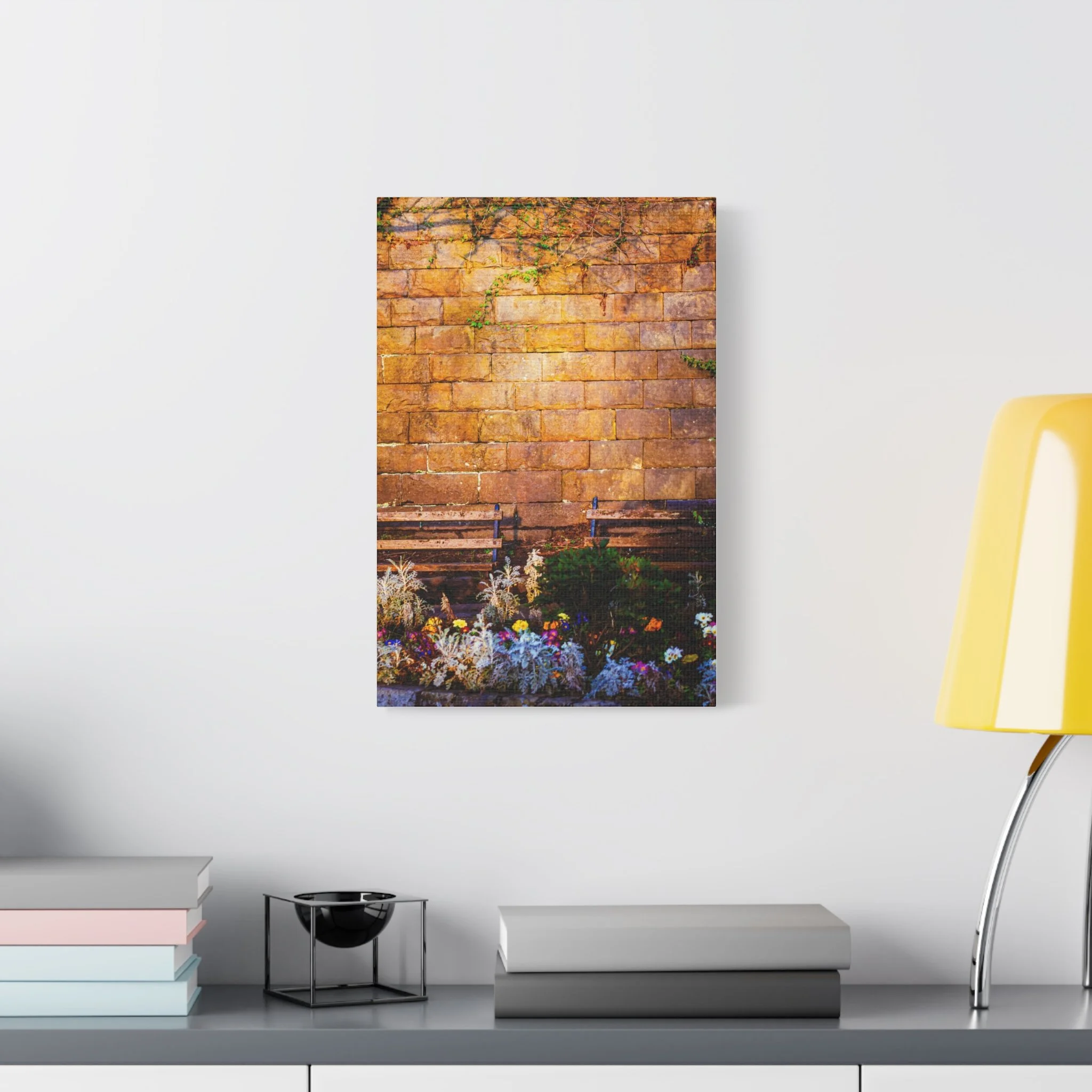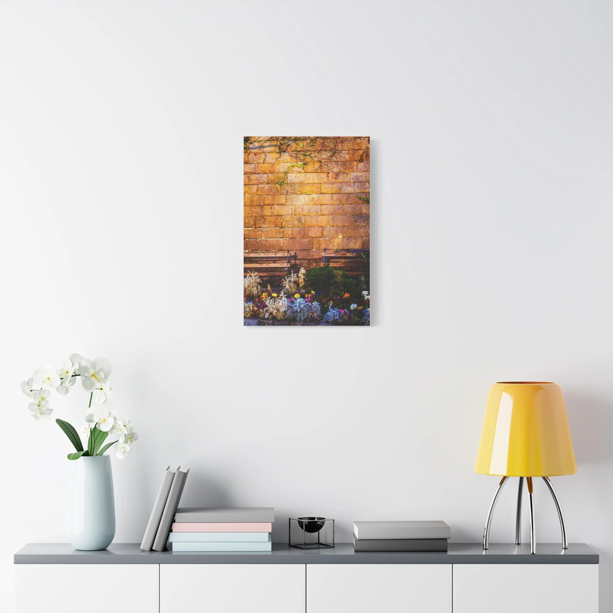 Garden Bench Against Rustic Brick Wall — Matte Stretched Canvas
