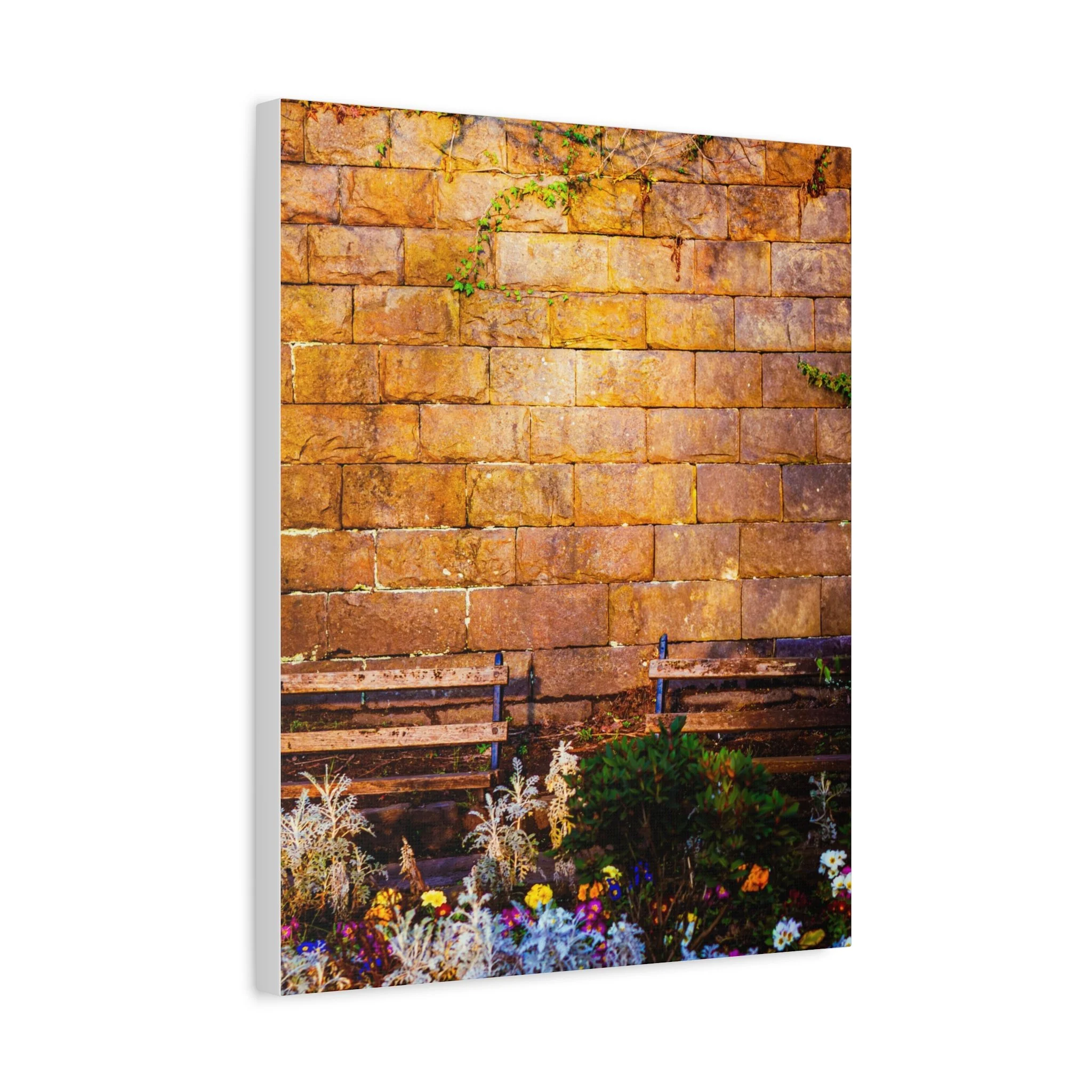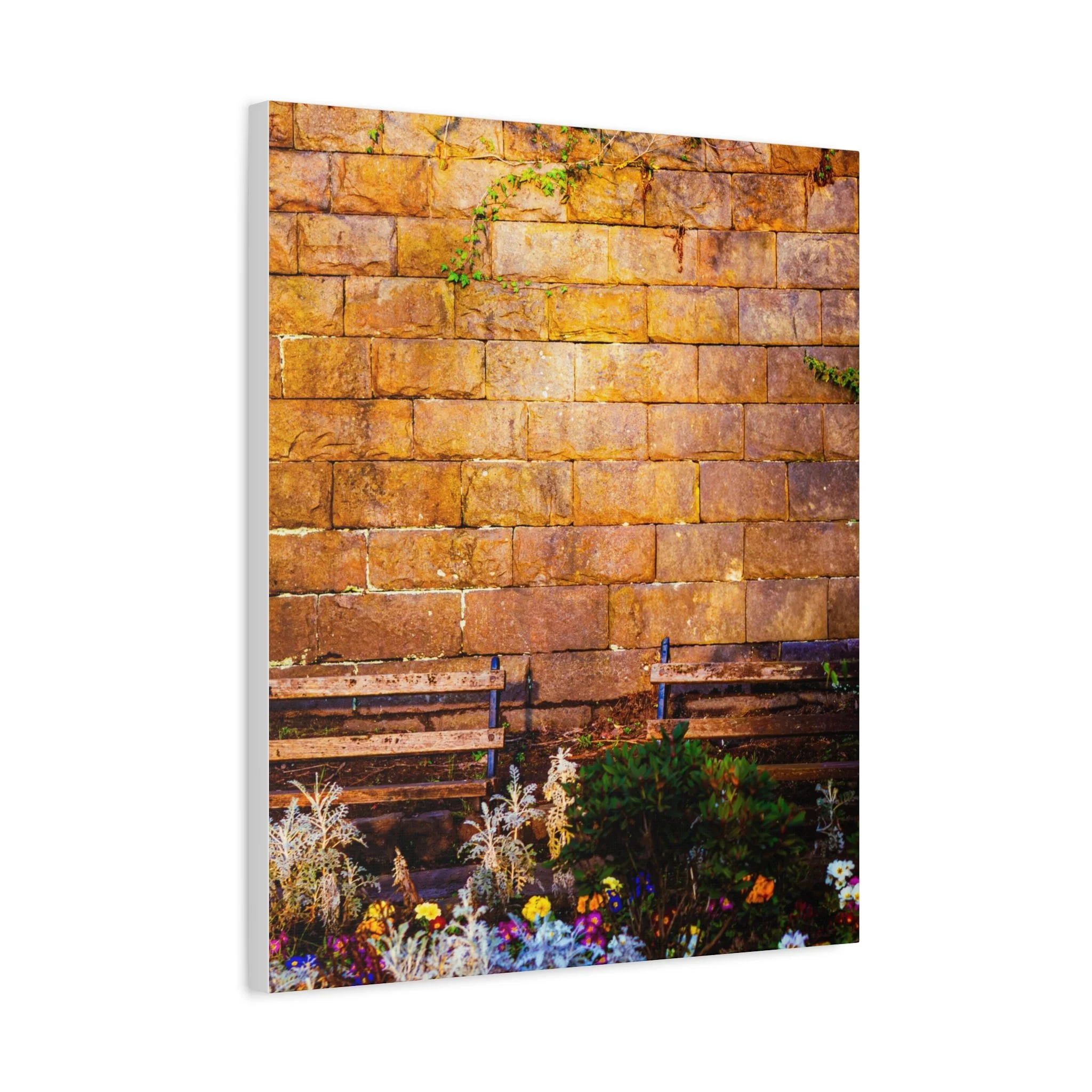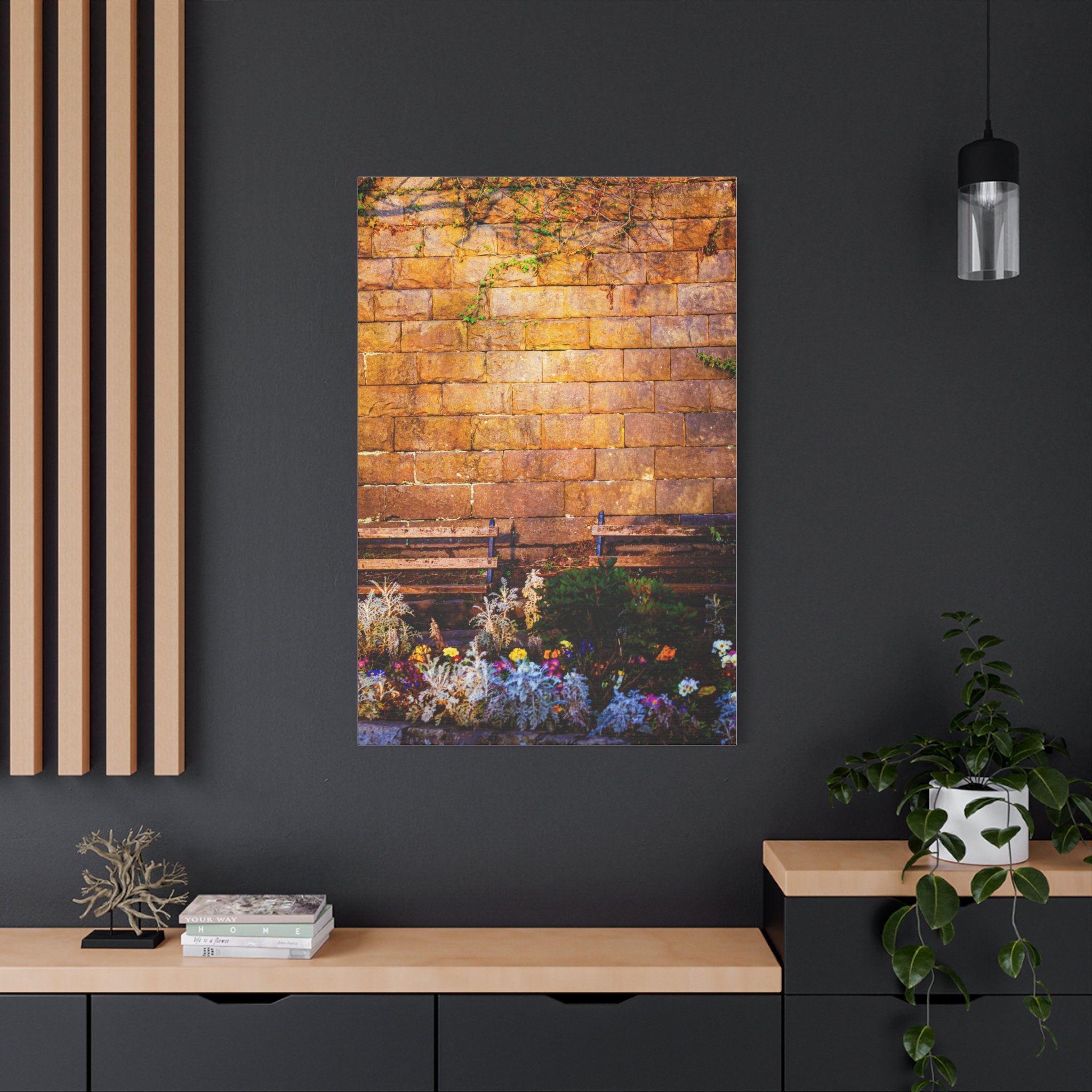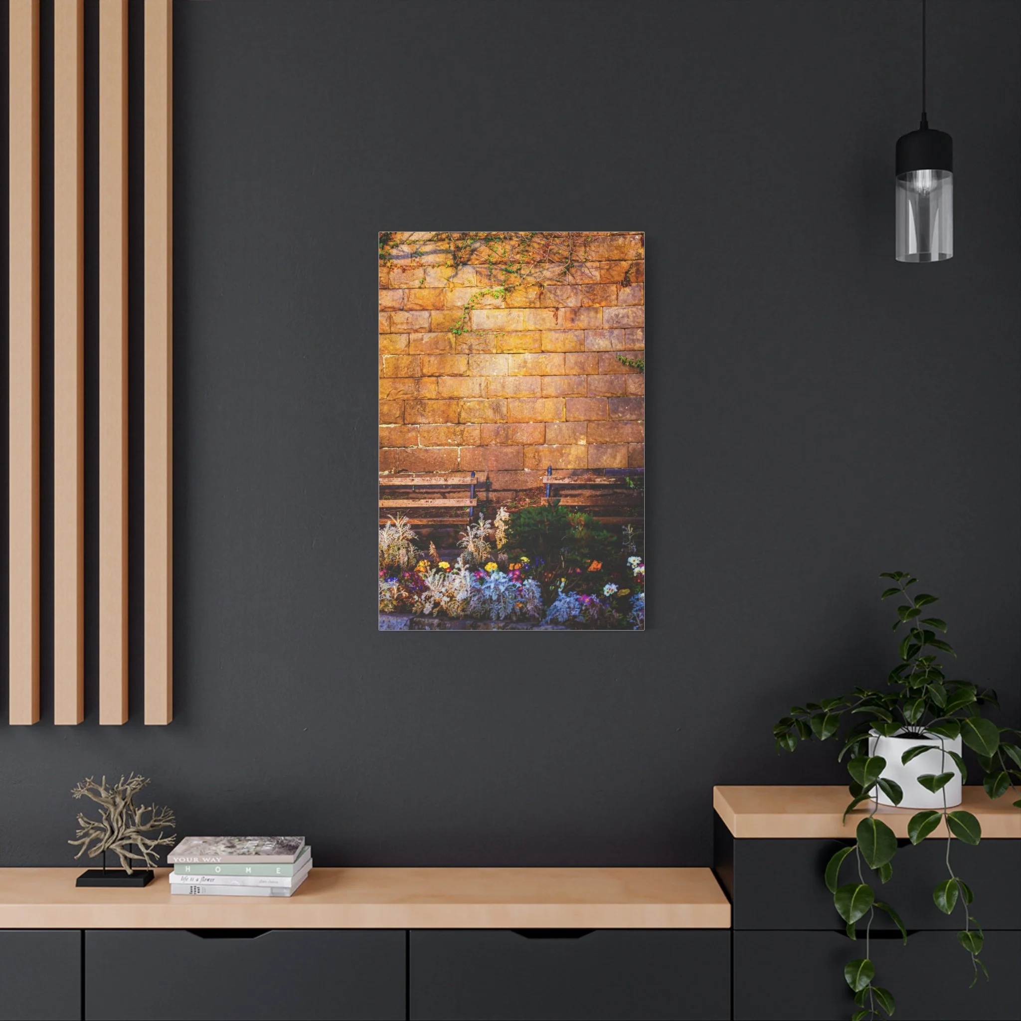 Garden Bench Against Rustic Brick Wall — Matte Stretched Canvas