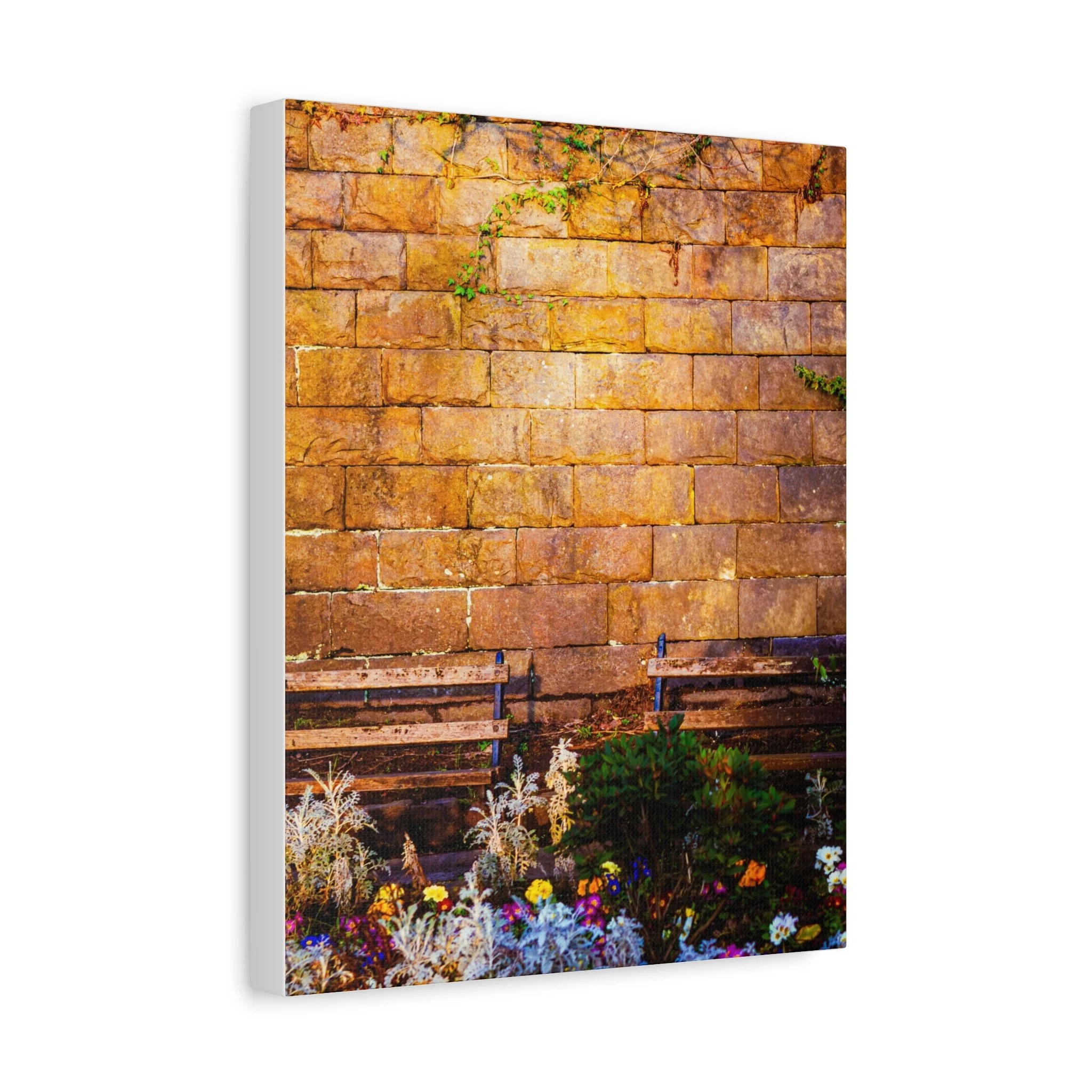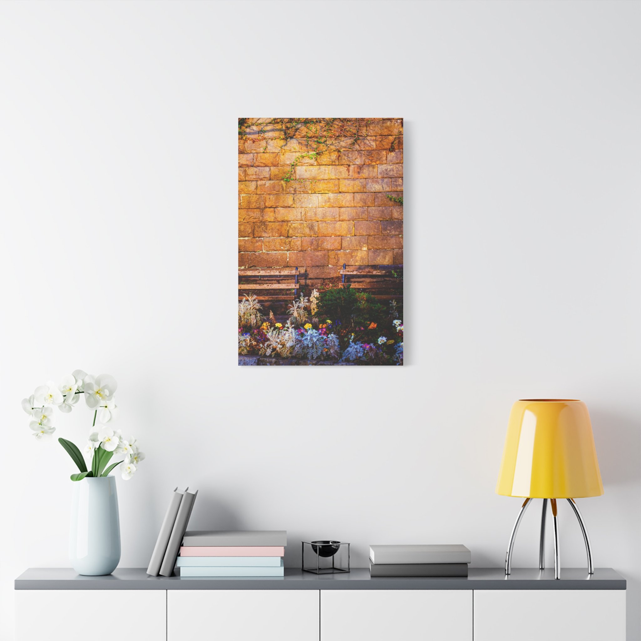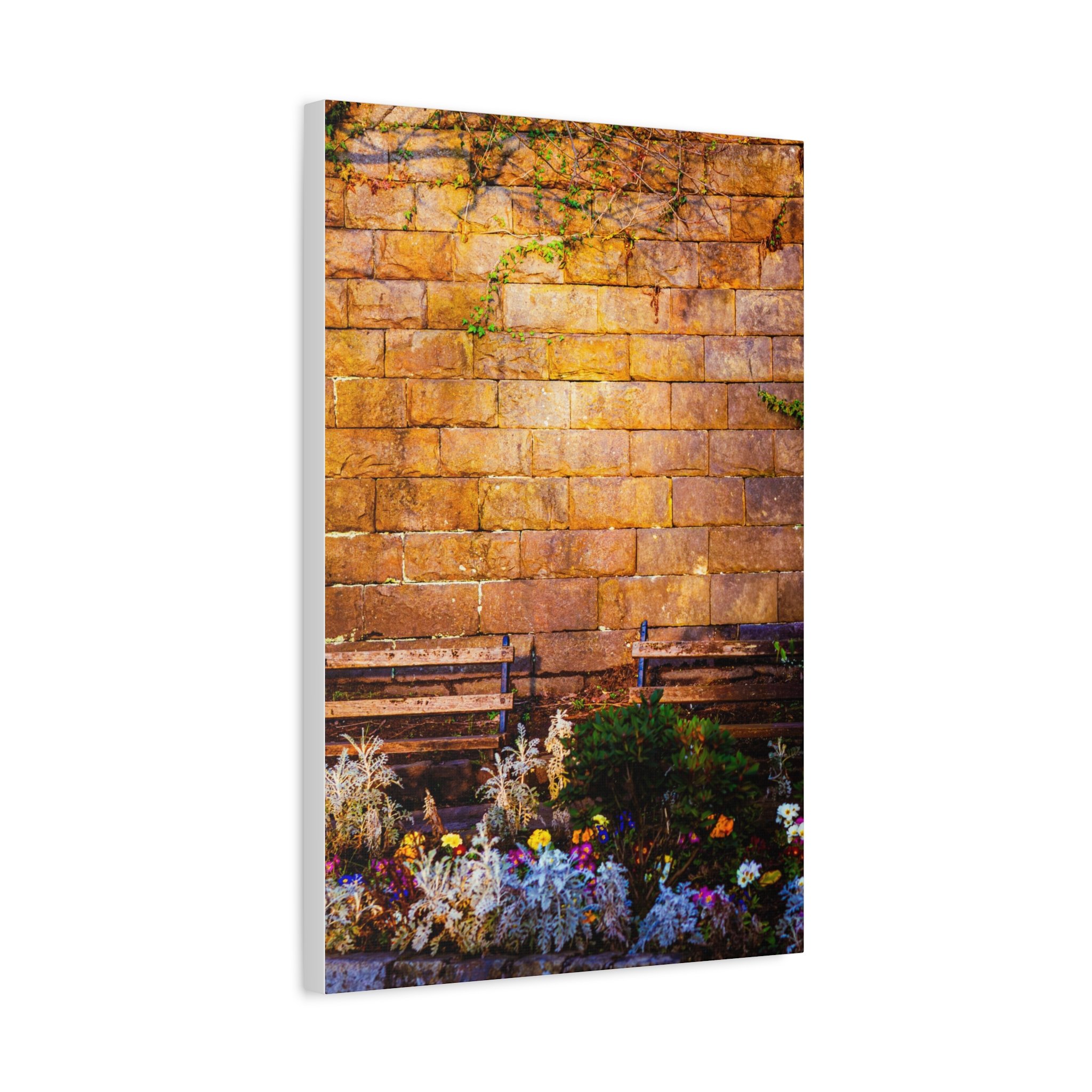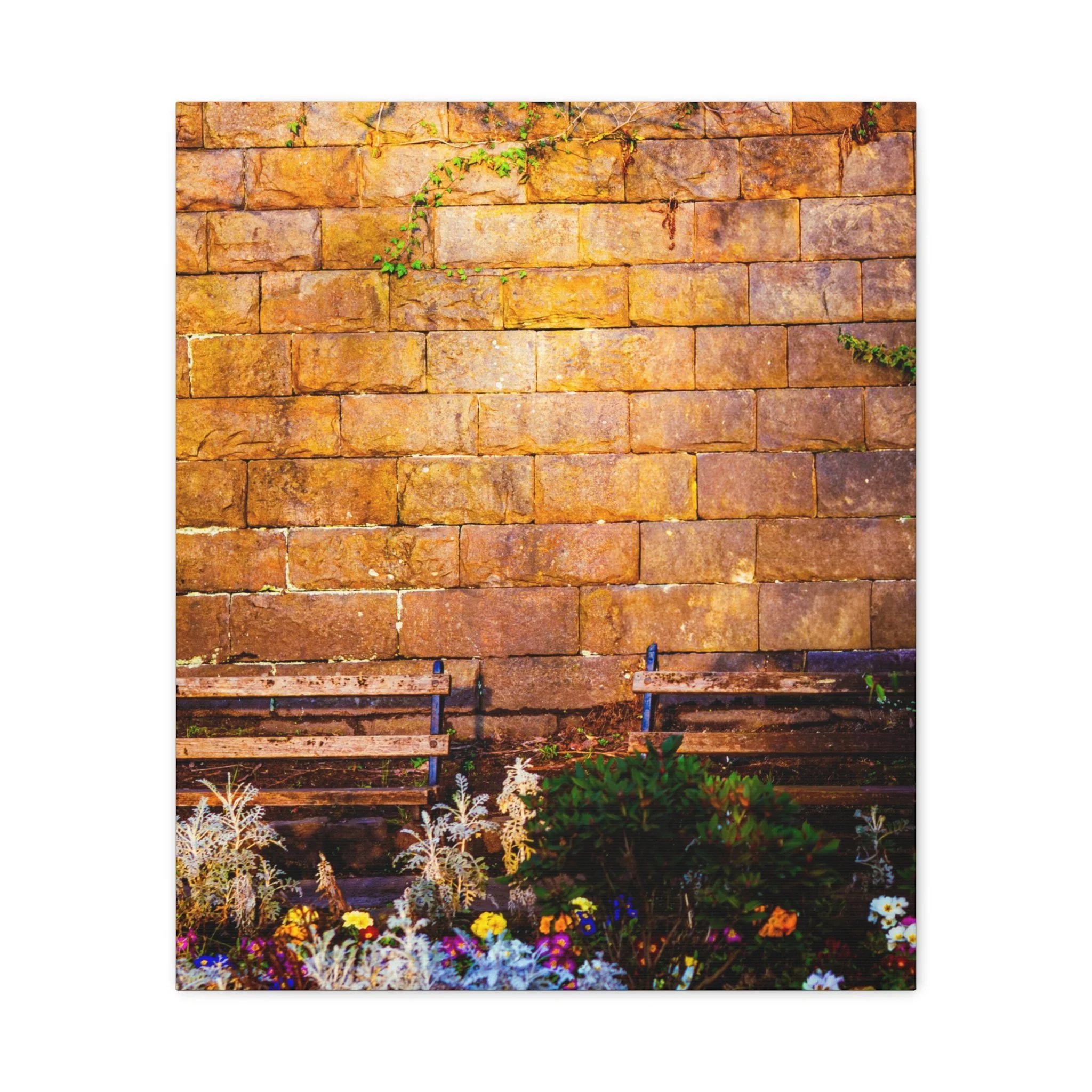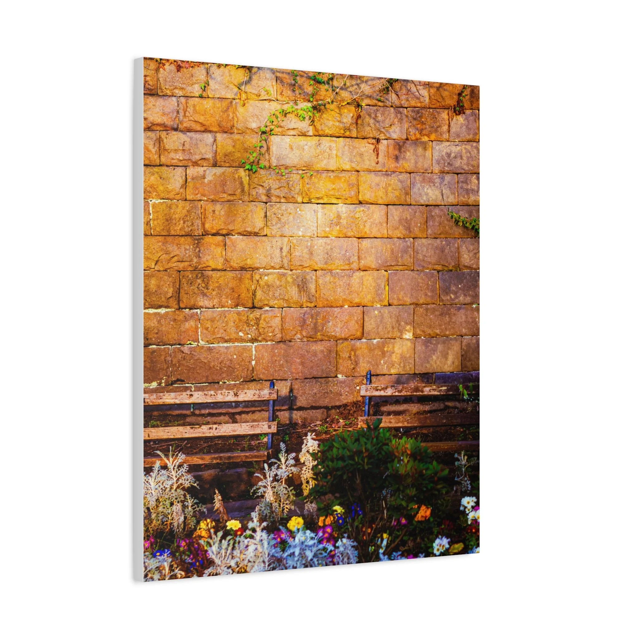 Garden Bench Against Rustic Brick Wall — Matte Stretched Canvas