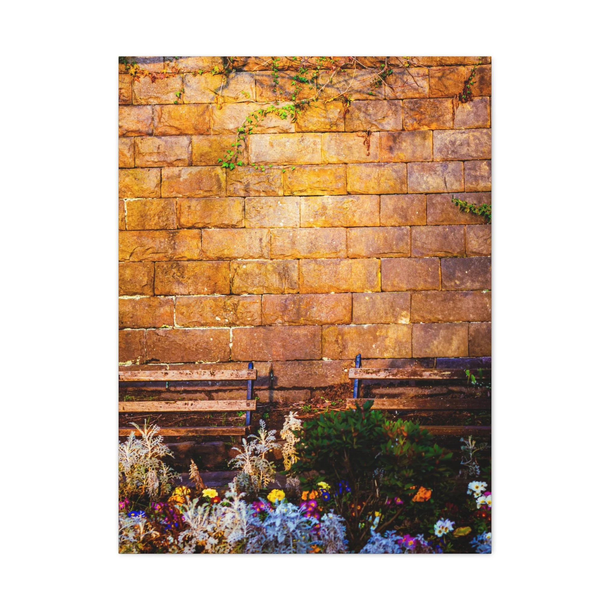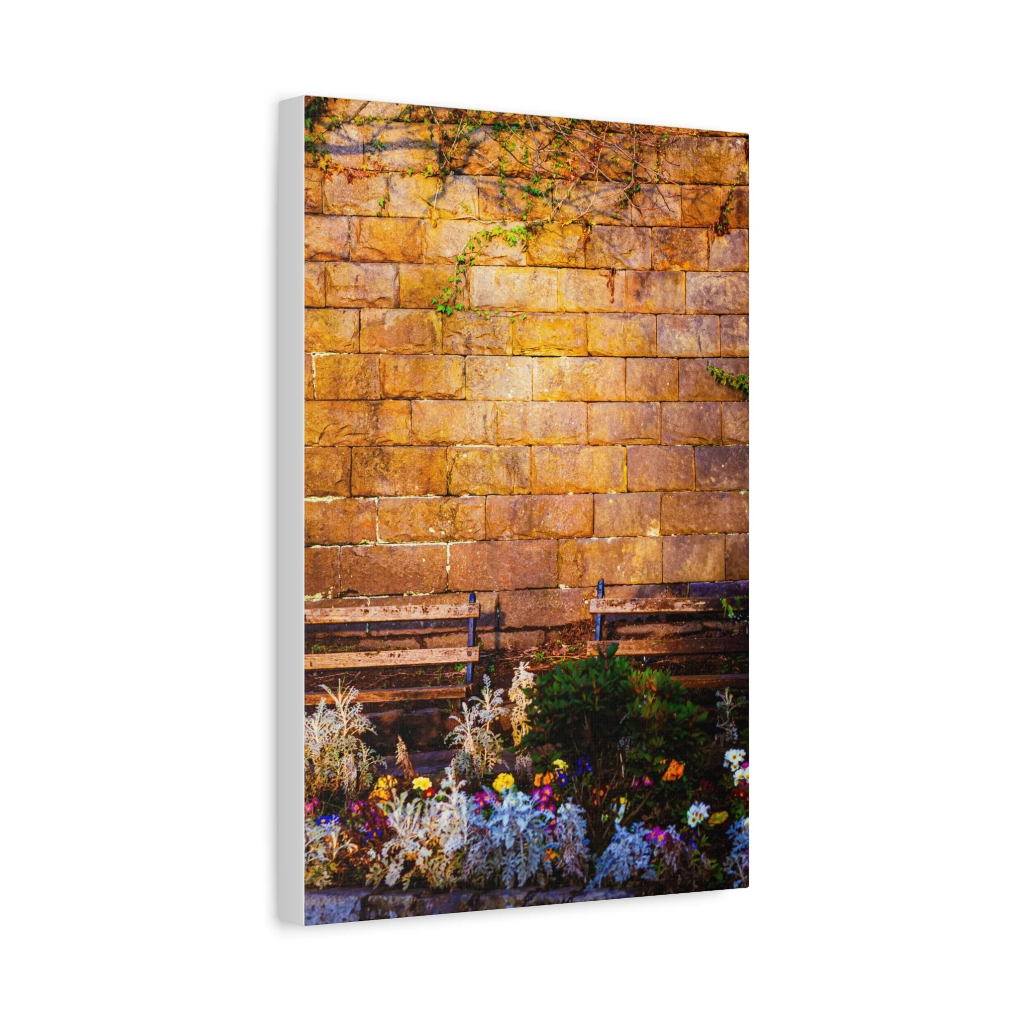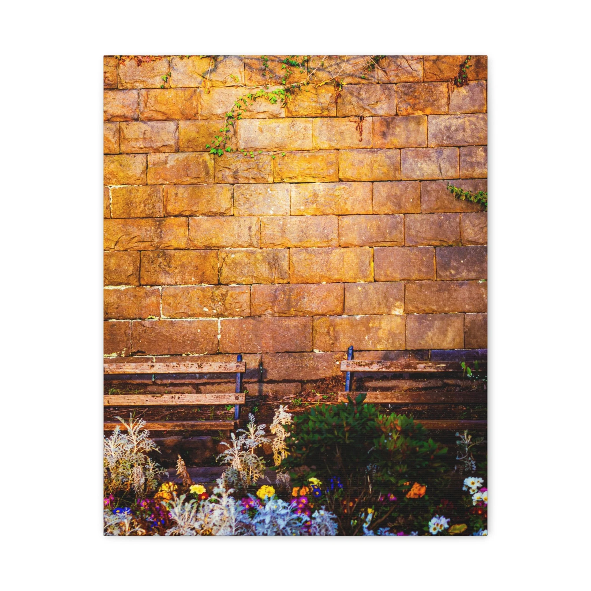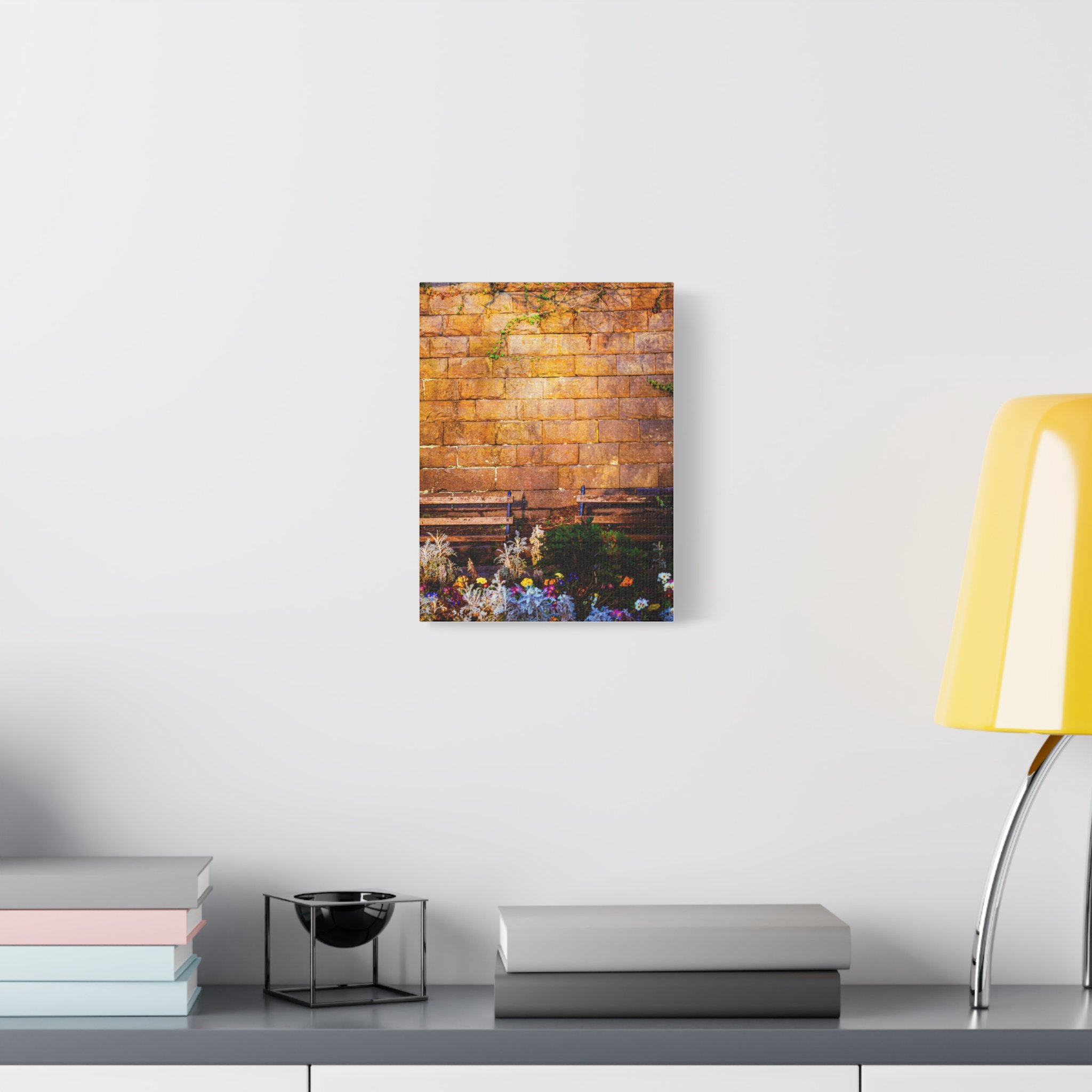 Garden Bench Against Rustic Brick Wall — Matte Stretched Canvas
