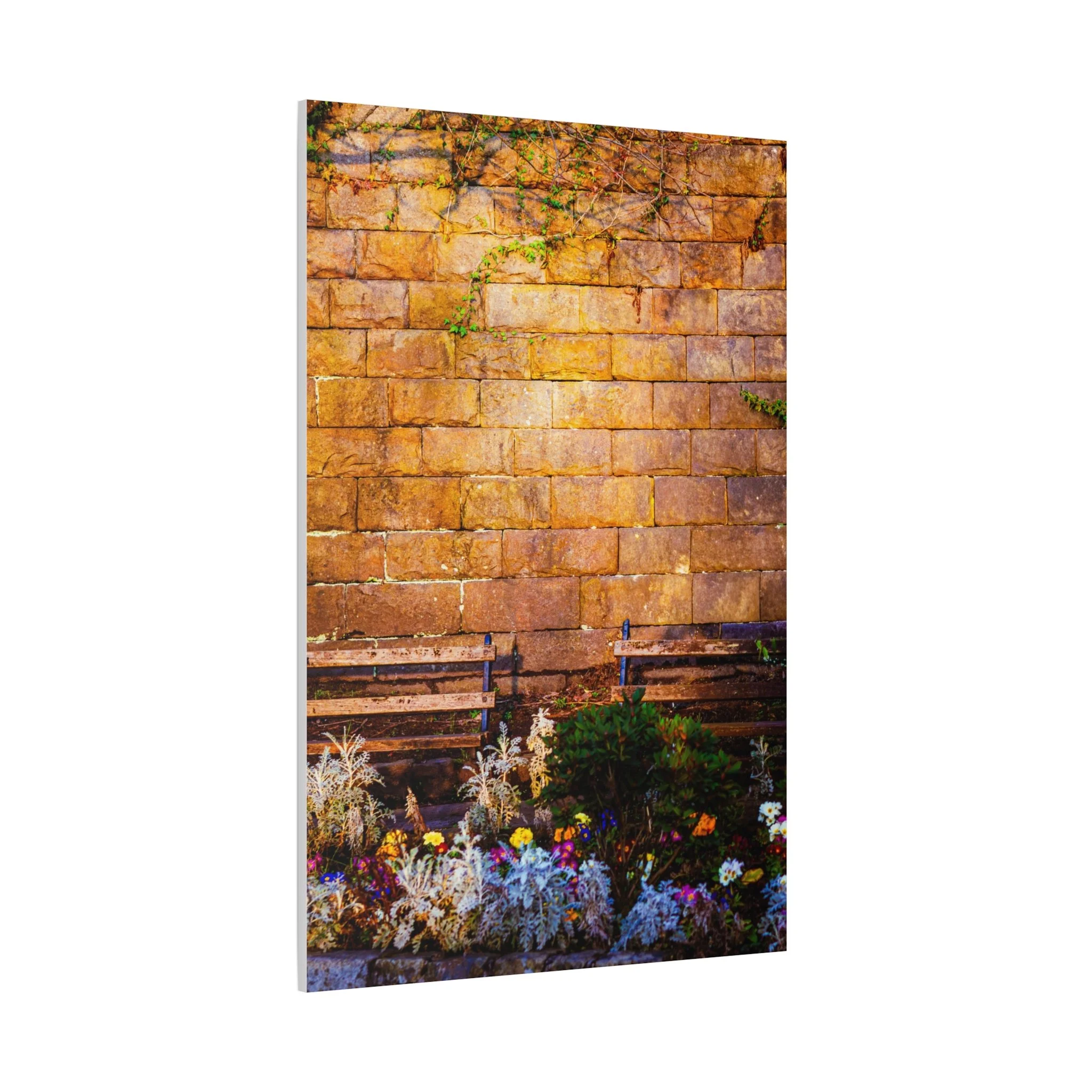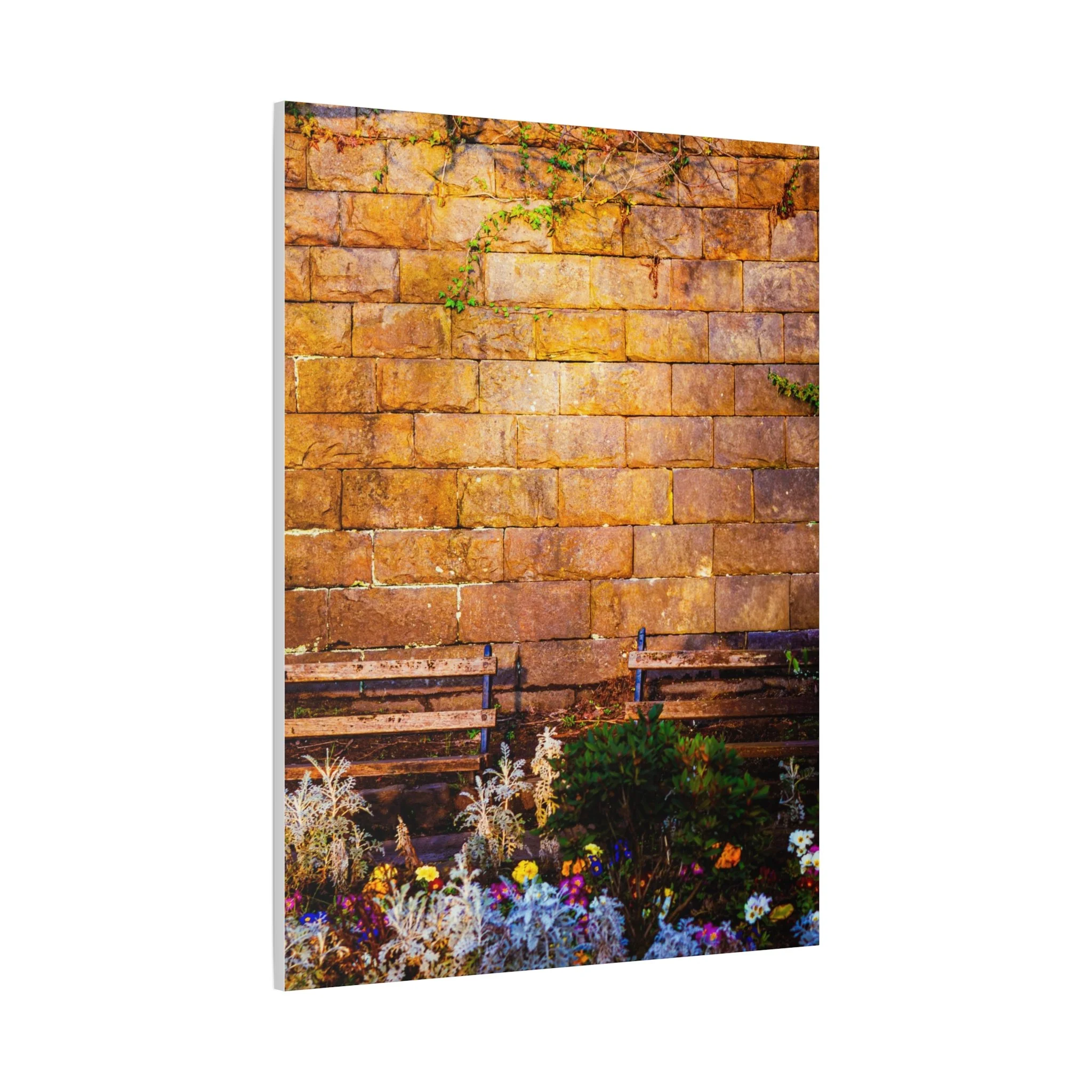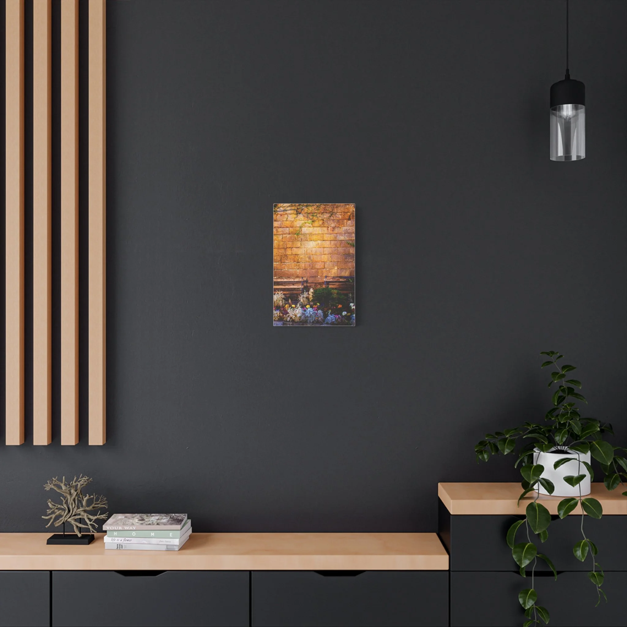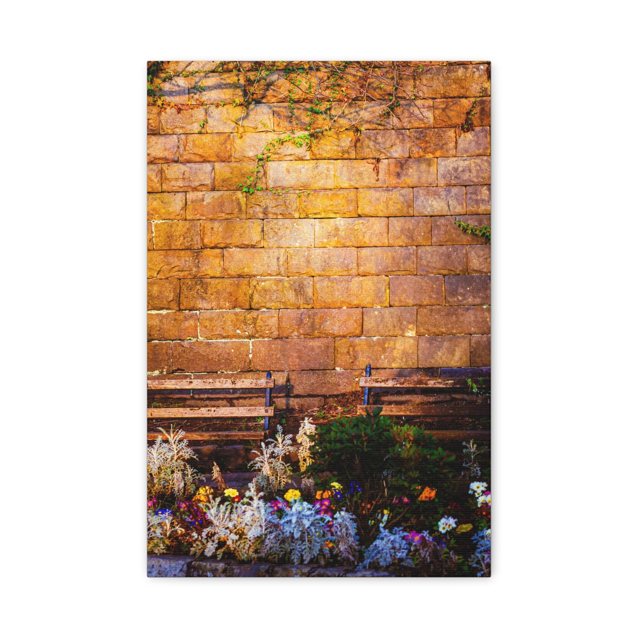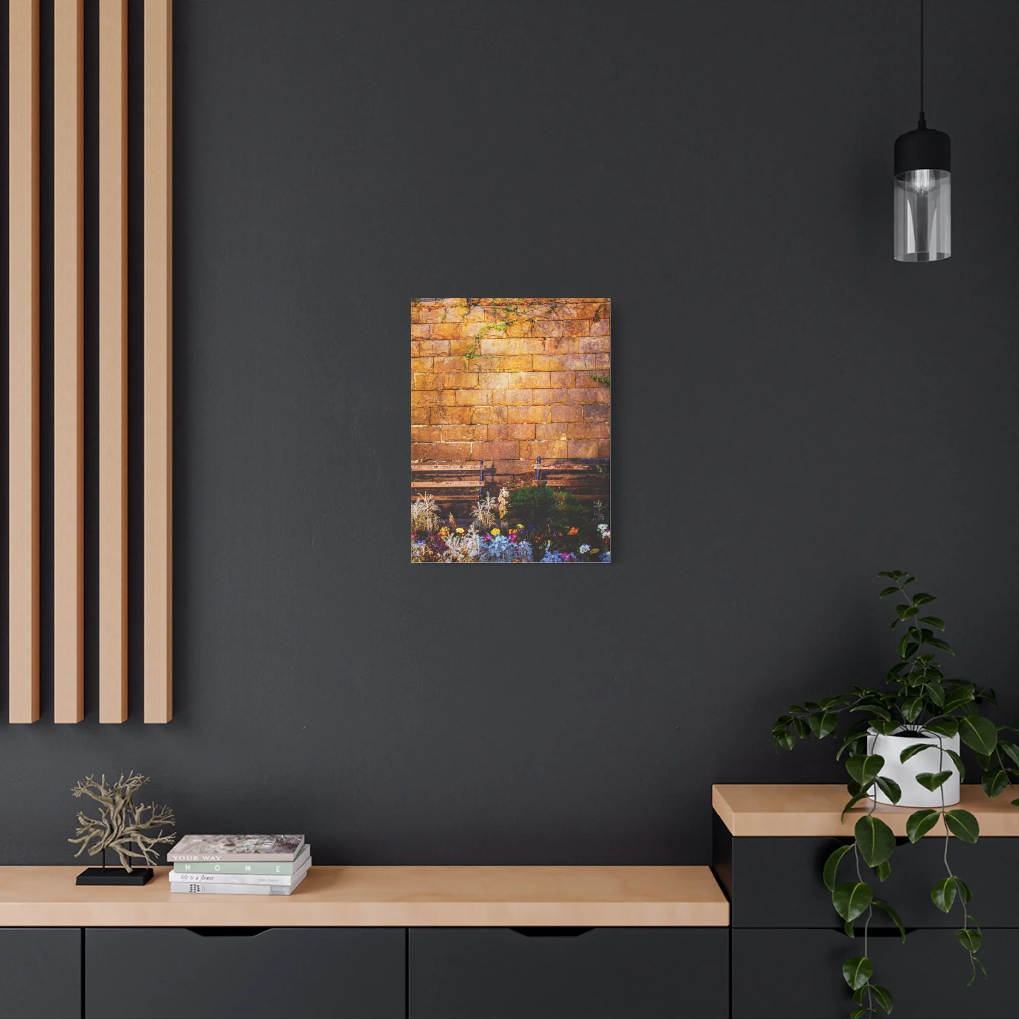 Garden Bench Against Rustic Brick Wall — Matte Stretched Canvas