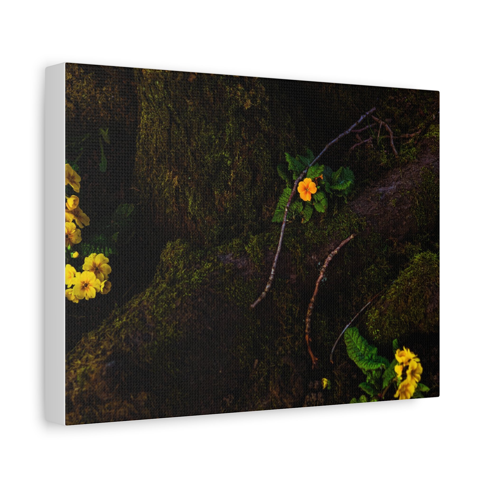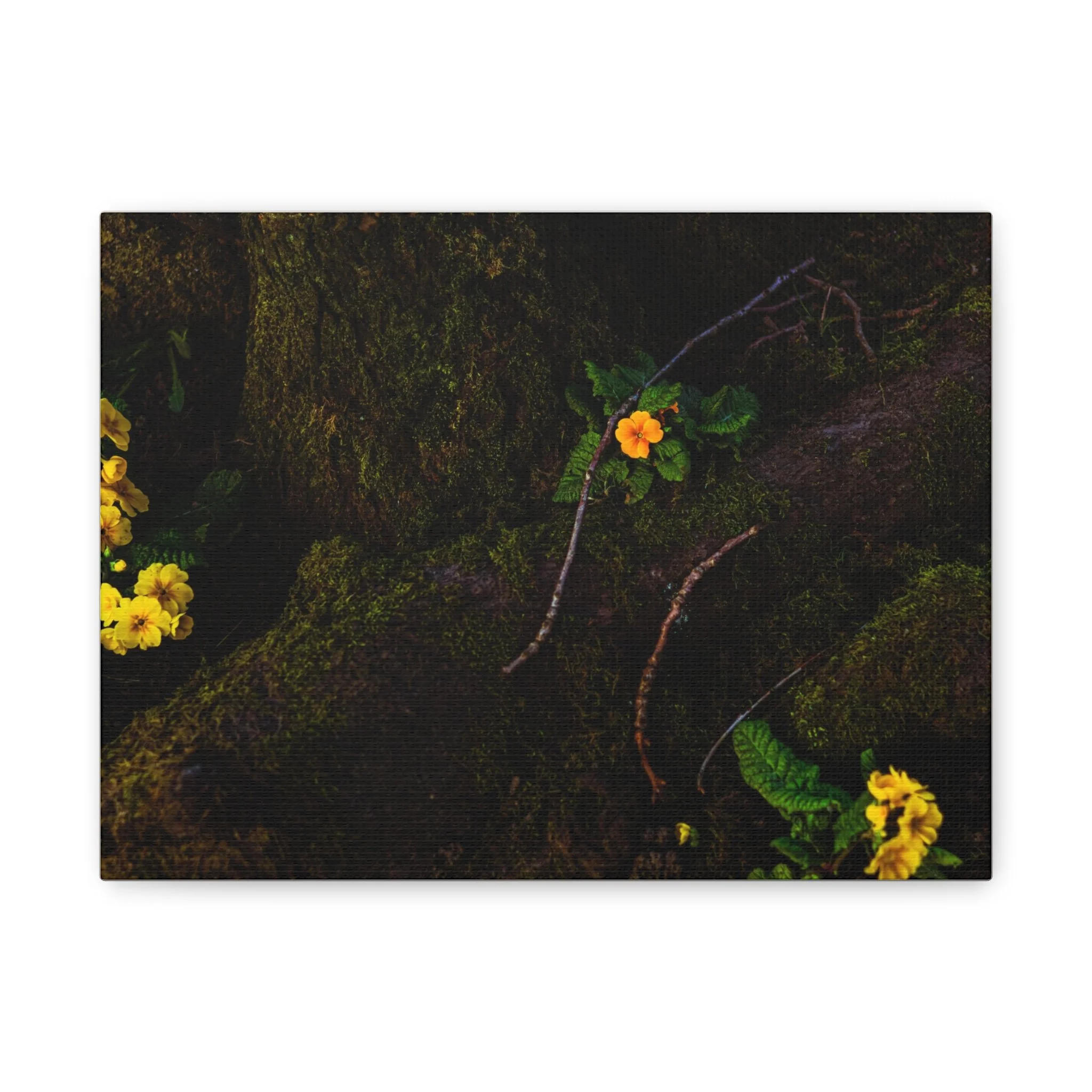 Bring a quiet corner of the forest into your home with this matte stretched canvas. Deep, mossy tones cradle small yellow blossoms and delicate twigs — a study in soft contrast that feels both grounded and intimate. Hung above a reading nook or leaned on a mantel, the print invites slow moments: morning coffee, late-afternoon light, and the calm that follows a woodland walk. The subtle texture of the matte surface keeps reflections low and colors rich, so the scene reads like a memory rather than a photograph. It’s for people who collect quiet things: botanists, nature lovers, and anyone who prefers calm over clutter. Works especially well in cozy living rooms, cabin retreats, or as a thoughtful addition to a housewarming or seasonal refresh.